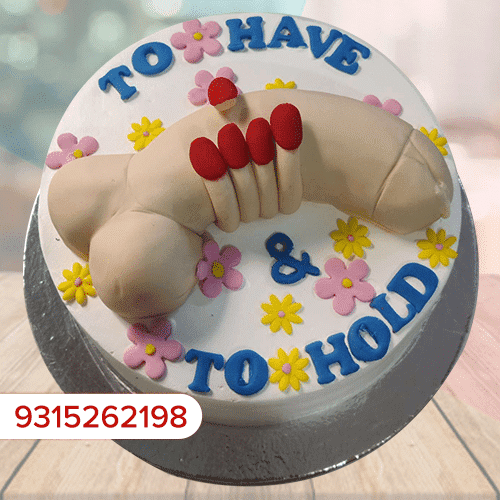This cheeky bachelor cake features a bold fondant design of a penis being held by a hand with red nails, complemented by the customized message “To Have & To Hold.” Decorated with colorful flowers, it’s perfect for adding humor and fun to a bachelor party celebration. Freshly baked and made with 100% eggless ingredients, this cake is available in various sizes and flavors, making it a standout centerpiece that’s sure to get a laugh and make the event unforgettable!