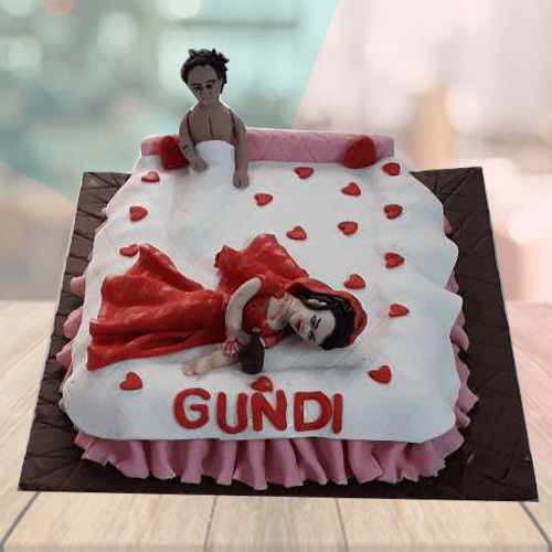 Surprise the bride-to-be with this fun and playful cake, perfect for bachelorette parties! Decorated with humorous fondant figures, this cake adds a light-hearted touch to the celebration. Available in a variety of flavors and sizes, it’s sure to be a hit at any party.