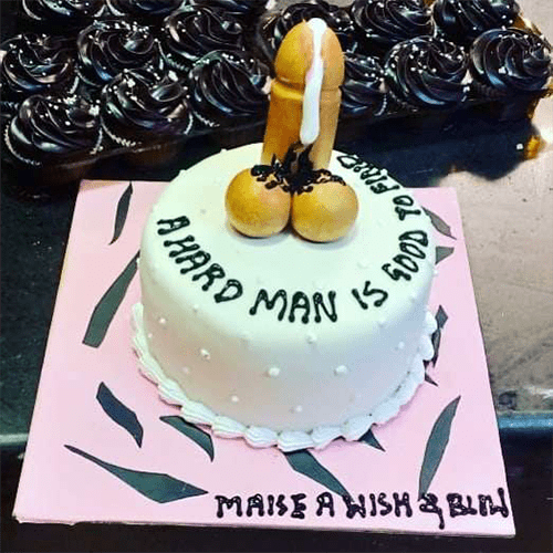 This humorous cake features a bold fondant design of a male penis, complete with a dripping detail, and a playful message “A Hard Man is Good to Find.” The cake adds a cheeky and light-hearted touch to bachelor or bachelorette parties, sure to entertain guests. Freshly baked and made with 100% eggless ingredients, this cake is available in various sizes and flavors, making it a fun and memorable centerpiece for any adult-themed celebration.