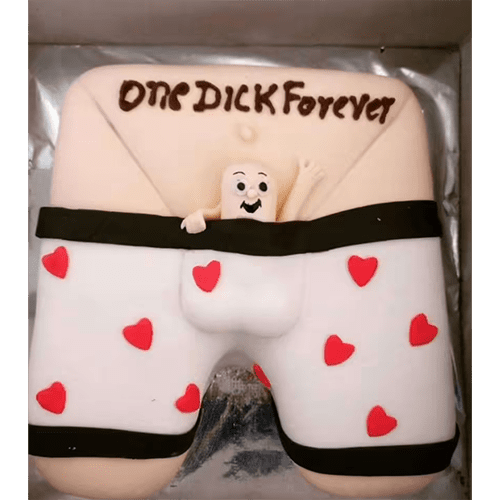 This unique cake showcases a creative design featuring a lower body in heart-patterned boxers, with a fondant figure peeking out. The cheeky humorous message “One Dick Forever” adds a lighthearted touch, making it an ideal choice for bachelor or bachelorette parties. Freshly baked and made with 100% eggless ingredients, this cake is available in a variety of sizes and flavors. It’s sure to bring smiles and fun to any adult-themed celebration!